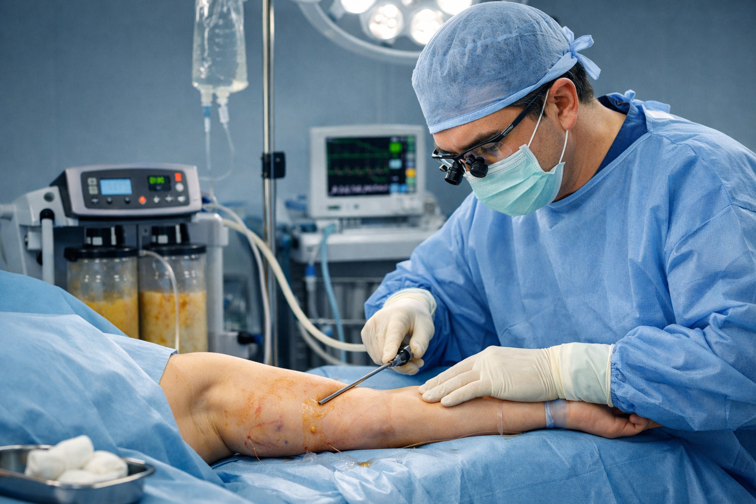 Сама операция выполняется через небольшие проколы кожи, которые располагаются в малозаметных местах - чаще всего в естественных складках. Через эти доступы вводятся тонкие канюли, с помощью которых жировая ткань аккуратно отделяется и удаляется. В зависимости от объема вмешательства и индивидуальных показаний применяется местная анестезия с седацией либо общая анестезия. Продолжительность процедуры обычно составляет от одного до двух часов.
